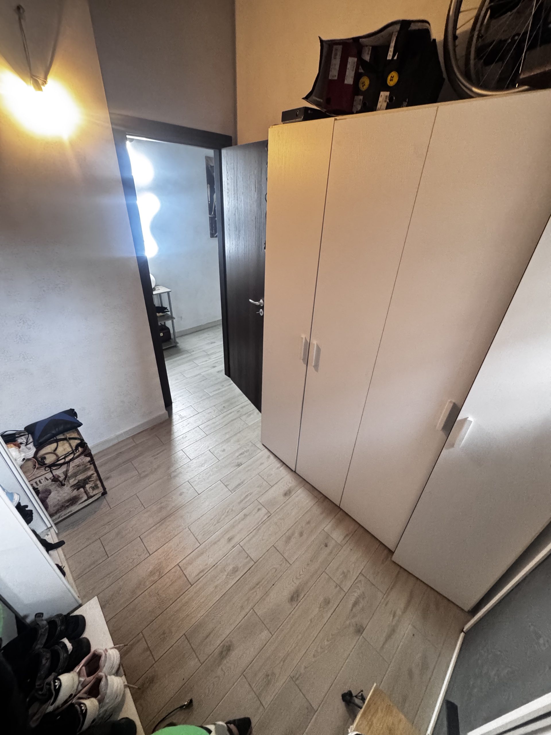 L’abitazione è composta da un luminoso soggiorno con angolo cottura, un corridoio, una camera matrimoniale, una cameretta e un bagno con box doccia e finestra finestra.